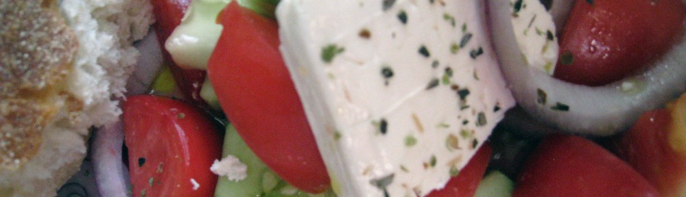 Typical of many cultures, other than the North American, Greeks traditionally eat their big meal in the midday, followed by a rest before heading back to work. The evening meal will be something light, salad and bread, for example. The traditional Greek salad (Horiatiki) is on every menu this time of year. It’s quick and easy to make, pretty to look at and perfectly healthy to eat.