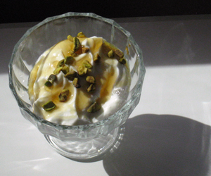 For dessert, drizzle Greek yogurt with thyme honey and top with pistachios.