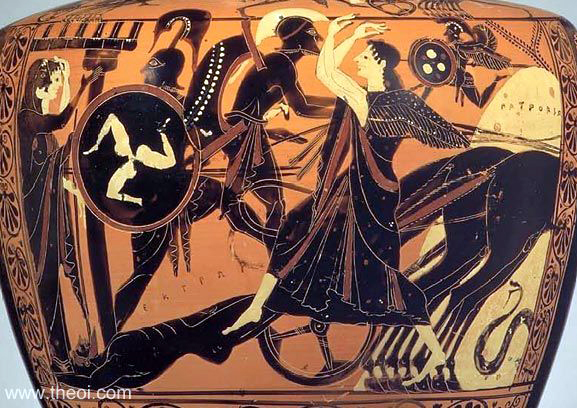 achilles_hector_theoi Published February 5, 2014 at 577 × 408 in Troy Greek vase painting of Achilles dragging the body of Hector, photo from theoi.com